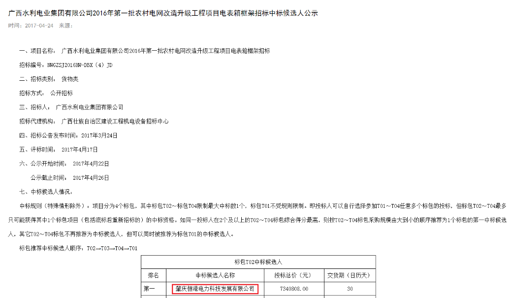 廣西水利電業(yè)集團有限公司2016年第一批農(nóng)村電網(wǎng)改造升級工程項目電表箱框架招標(biāo)中標(biāo)候選人公示