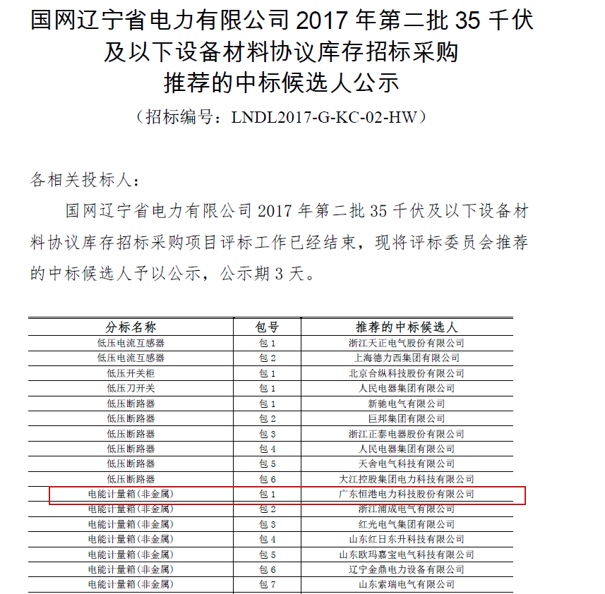 國(guó)網(wǎng)遼寧省電力有限公司2017年第二批35千伏及以下設(shè)備材料協(xié)議庫(kù)存招標(biāo)采購(gòu)中標(biāo)候選人公示