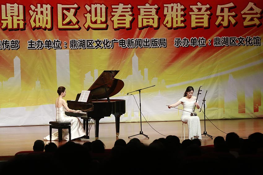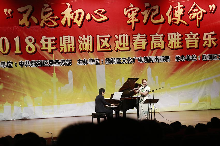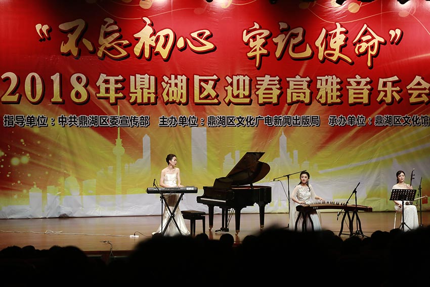演藝中心華燈璀璨,文化舞臺(tái)音韻悠揚(yáng),2018年1月18日晚,由鼎湖區(qū)委宣傳部指導(dǎo)、區(qū)文廣新局主辦的“不忘初心 牢記使命”2018鼎湖區(qū)迎新年高雅音樂(lè)會(huì)在區(qū)演藝中心隆重上演。音樂(lè)會(huì)在悠揚(yáng)、悅耳的《苗嶺的早晨》中拉開(kāi)帷幕。經(jīng)典樂(lè)曲《梁?!贰盾岳蚧ā返葮?lè)曲讓眾人深情抒發(fā)回到靈魂深處的情懷,耳熟能詳?shù)牧餍袠?lè)曲《卷珠簾》改編成鋼琴曲則拉近了觀眾與演奏者的距離,令觀眾產(chǎn)生情感共鳴,贏得滿堂掌聲。最后,晚會(huì)在四人合奏經(jīng)典名曲《茉莉花》中完美落幕。