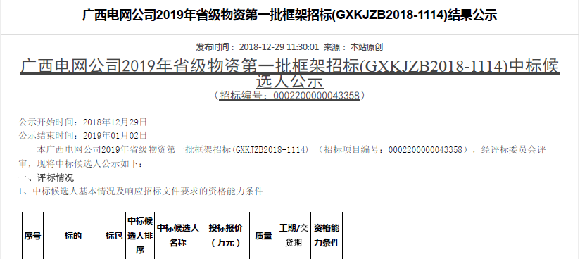 熱烈祝賀我司在廣西電網公司2019年省級物資第一批框架招標(GXKJZB2018-1114)中標