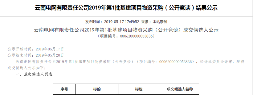 熱烈祝賀我司在云南電網有限責任公司2019年第1批基建項目物資采購(公開競談)中標