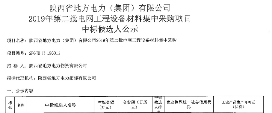 熱烈祝賀我司在陜西省地方電力(集團)有限公司2019年第二批電網工程設備材料集中采購中標