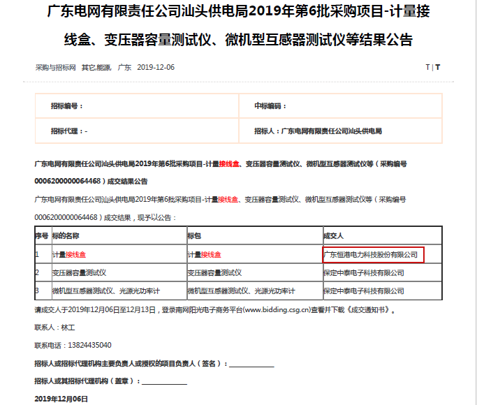 熱烈祝賀我司在廣東電網有限責任公司汕頭供電局2019年第6批采購項目-計量接線盒、變壓器容量測試儀、微機型互感器測試儀等結果中標
