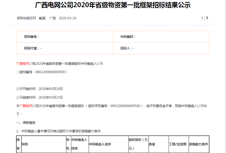 熱烈祝賀我司在廣西電網(wǎng)公司2020年省級(jí)物資第一批框架招標(biāo)中標(biāo)
