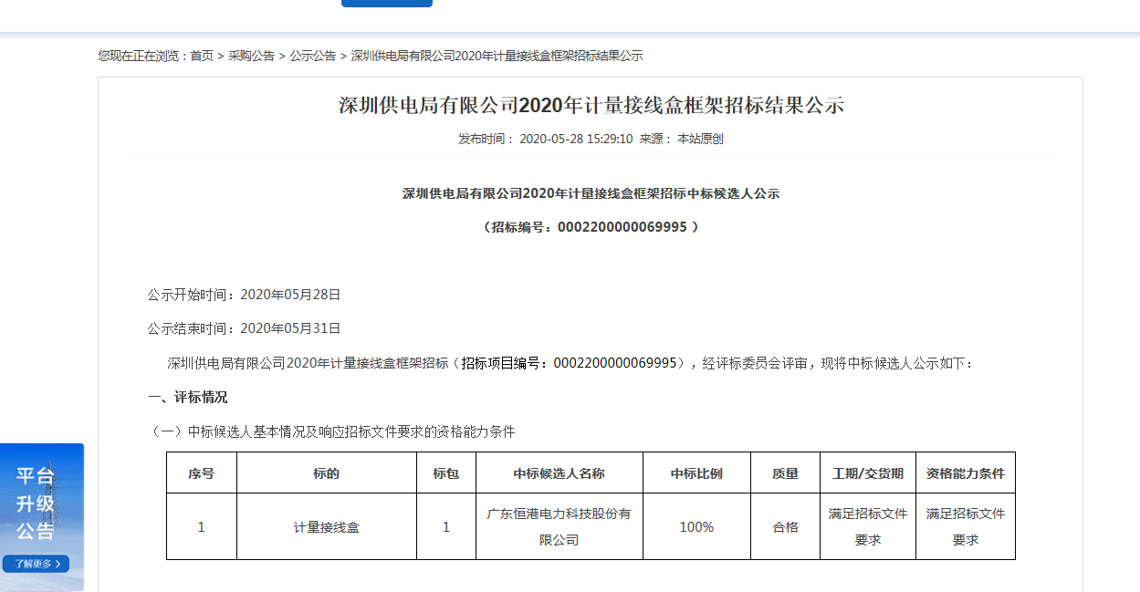 熱烈祝賀我司在深圳供電局有限公司2020年計量接線盒框架招標中標