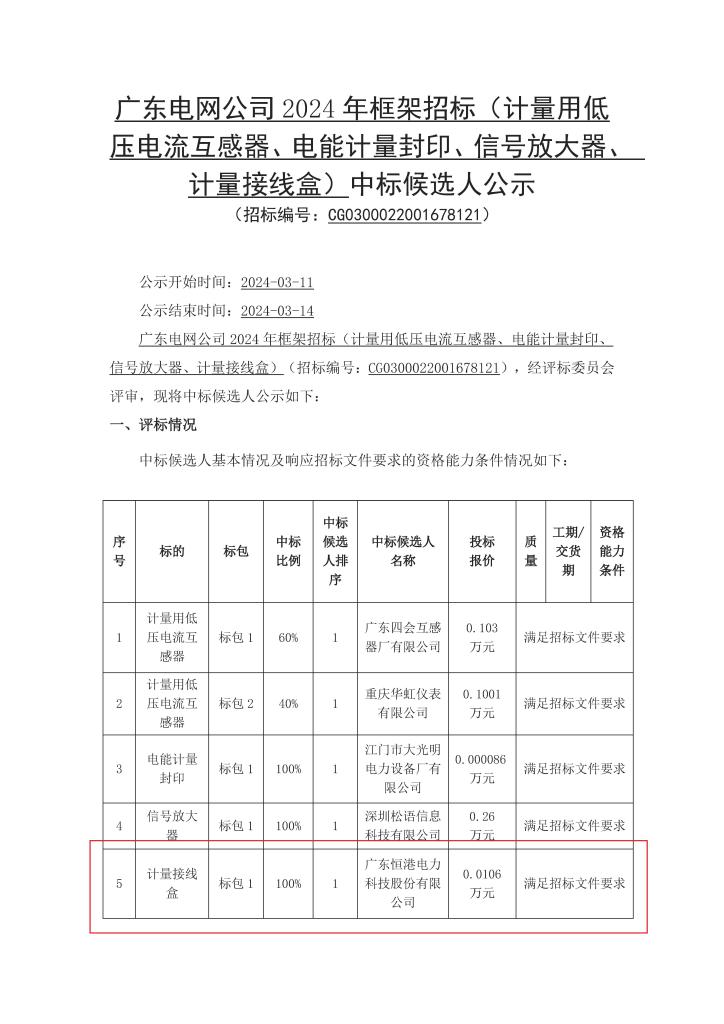 奮力拼搏創佳績,喜奪龍年開門紅。2024年3月2日,南方電網供應鏈統一服務平臺中標結果公示,我司成功中標“廣東電網公司 2024 年框架招標(計量用低壓電流互感器、電能計量封印、信號放大器、計量接線盒)”項目“接線盒”標段。成功中標,離不開恒港人的努力和汗水。讓我們繼續攜手共進,再奪佳績!