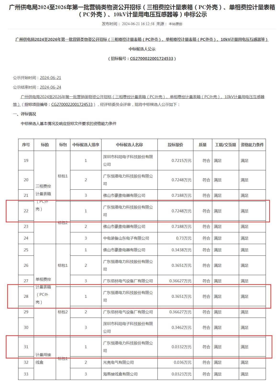 【喜中三元】熱烈祝賀我司中標“廣州供電局2024年至2026年第一批營銷類公開招標(三相費控計量表箱(PC外殼)、單相費控計量表箱(PC外殼)、10KV計量用電互感器等)”項目