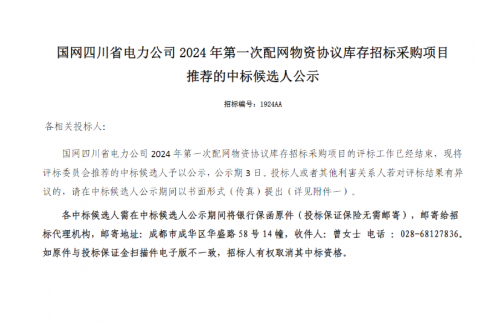 【中標(biāo)喜訊】熱烈祝賀我司中標(biāo)國網(wǎng)四川省電力公司2024年第一次配網(wǎng)物資協(xié)議庫存招標(biāo)采購項目