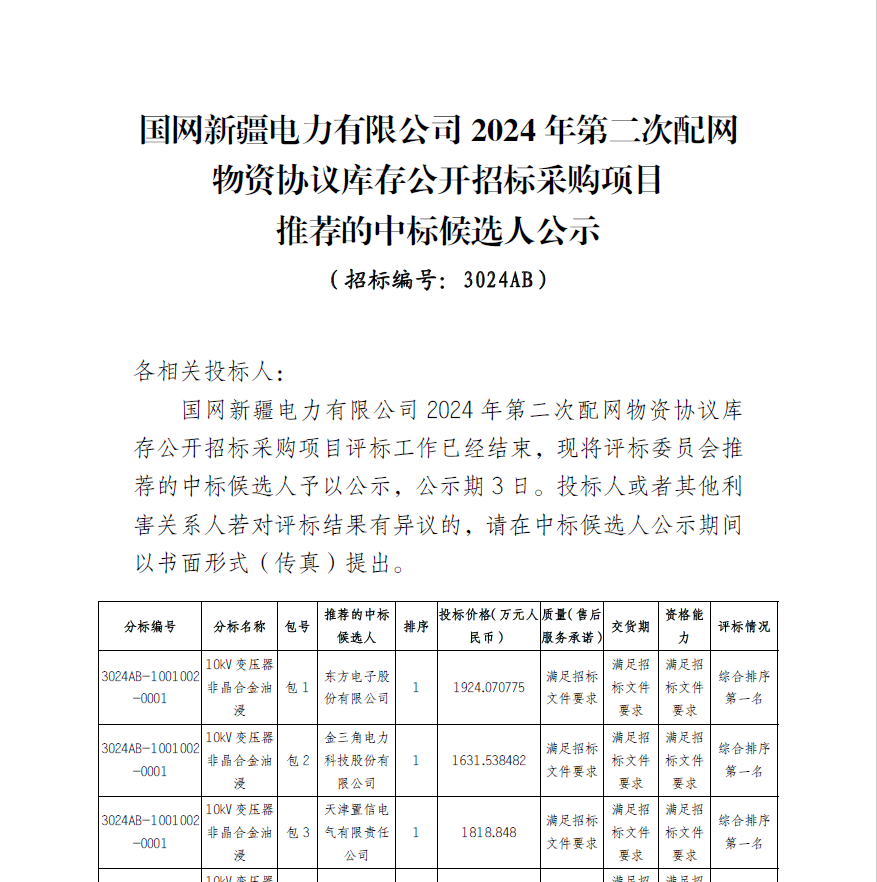 【中標喜訊】熱烈祝賀我司中標國網新疆電力有限公司2024年第二次配網物資協議庫存公開招標采購項目