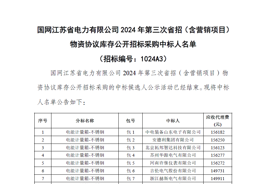 【中標(biāo)喜訊】熱烈祝賀我司中標(biāo)國(guó)網(wǎng)江蘇省電力有限公司2024年第三次省招(含營(yíng)銷(xiāo)項(xiàng)目)物資協(xié)議庫(kù)存公開(kāi)招標(biāo)采購(gòu)項(xiàng)目